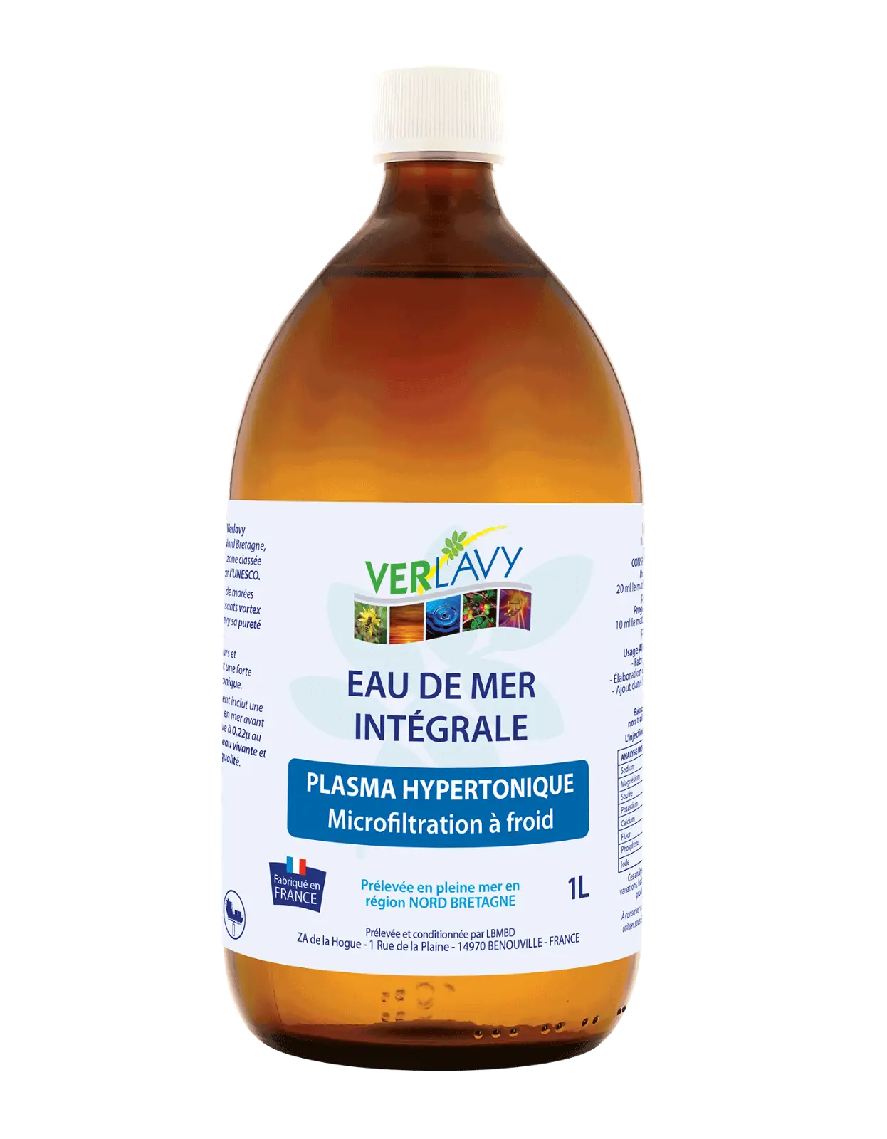 Recommandée par Hippocrate et les médecins arabes dès l’Antiquité, l’eau de mer servait à apaiser, purifier et renforcer. Aujourd’hui, l’eau de mer intégrale (hypertonique) est appréciée pour sa richesse naturelle en minéraux et oligo-éléments, en particulier le magnésium marin.
