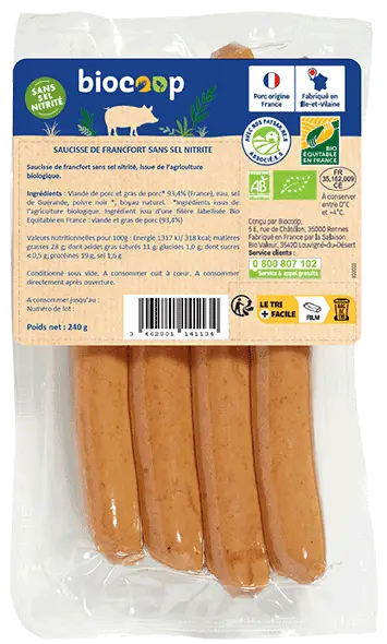 Le sel, et plus particulièrement le sel nitrité, est reconnu, par l’ANSES*, commefacteur favorisant l’apparition du cancer colorectal. C'est pourquoi, chez Biocoop, nous avons choisi de nous passer du sel nitrité dans nos charcuteries de la marque Biocoop.