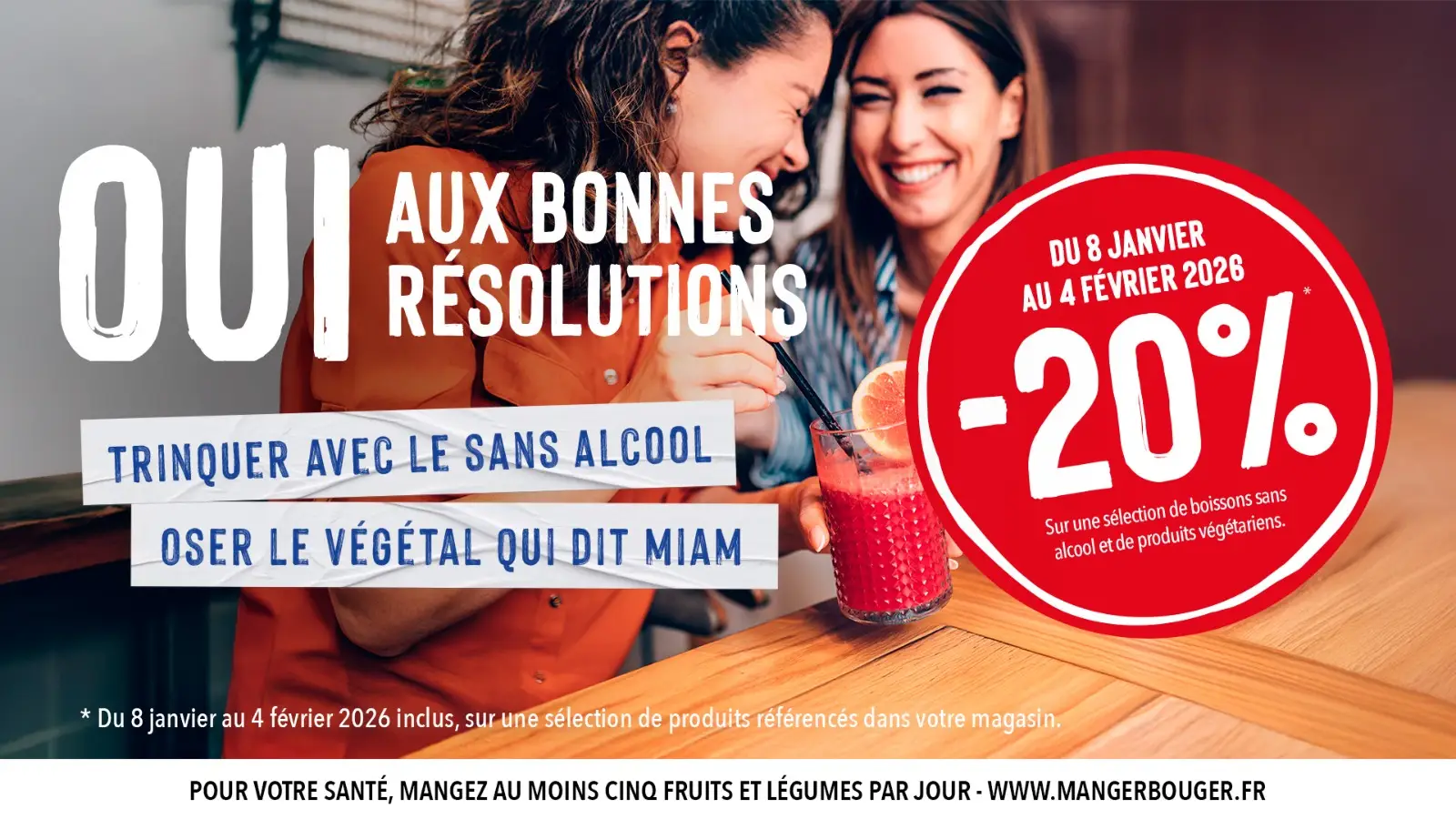 Kombucha à la grenade, boisson soja à la vanille, bière sans alcool, raviolis végétariens, tofu rosso aux olives et à la tomate… Bénéficiez de 20% de réduction sur une sélection de boissons sans alcool et de produits végétariens référencés dans votre magasin pour vous accompagner vers le mieux manger, pour votre santé et celle de la planète.