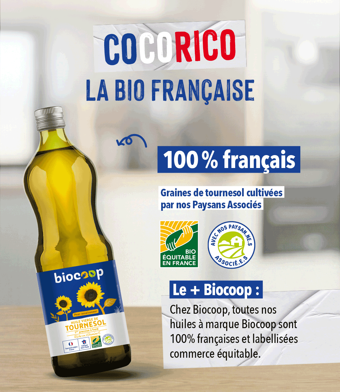 Ce mois-ci (re)-découvrez notre huile de tournesol, fabriquée par l’Huilerie Moog dans l’Ariège, à partir de graines cultivées en France. Nous aurions tout aussi bien pu vous présenter notre huile de colza, de lin, de cameline… ne cherchez pas plus loin, toutes les huiles de notre gamme à marque de Biocoop sont 100% françaises !